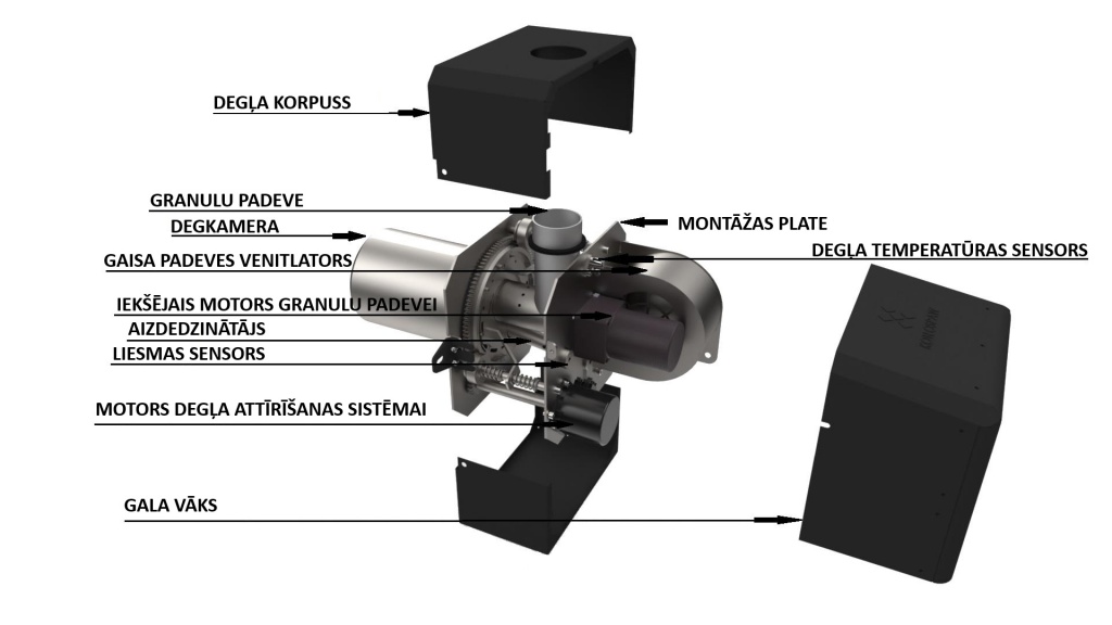 Gaisa padeves sistēmas pamatā tiek izmantots Vācijā izgatavoti ventilatori kam raksturīga klusa darbība un ilgs kalpošanas laiks. Degļa konstrukcijai pašai par sevi nav nepieciešama eļļošana vai periodiska maināmo  detaļu nomaiņa. Gultņu sistēma ir balstīta uz trim balstiem, kas darbojas buksēs. Galvenajā nodalījumā ir teflona blīve ar kalpošanas laiku līdz 15 gadiem. Degļa modulārā konstrukcija un labi pārdomātais dizains padara visas degļu detaļas un sastāvdaļas ar jaudu no 10-35 kW vienādas. Vienīgā atšķirība ir degkameras, un to izmēri.  Elektriskās plates un to komponentes paliek nemainīgas, tas būtiski atvieglo servisa darbus un apkalpošanu.