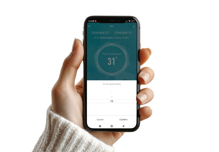 INSPIRO ERV iekārtas var aprīkot ar Wi-Fi moduli *, kas nodrošina pilnīgu kontroli, izmantojot viedtālruni. Savienojot to pārī ar lietotni Smart Life, var pārvaldīt ventilatora ātrumu, iekštelpu gaisa temperatūru un, ja ir uzstādīti papildu sensori, CO₂ un mitruma datus .
