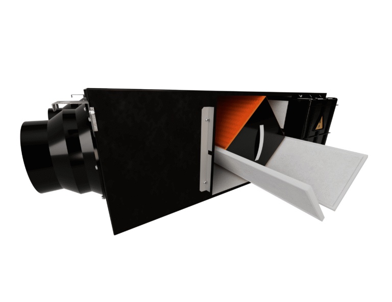 Korpuss ir izgatavots no cinkota tērauda un pārklāts ar izolācijas materiālu, kas uzlabo siltumizolāciju un samazina troksni. Tas ietver praktiskus montāžas kronšteinus vienkāršai uzstādīšanai un plastmasas kanālus, kas pielāgoti standarta ventilācijas cauruļu diametriem. Pārbaudes durtiņas nodrošina ērtu piekļuvi filtriem un entalpijas siltummainim.